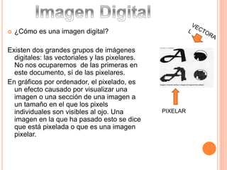 El documento describe las características básicas de las imágenes digitales pixeladas. Explica que están compuestas de píxeles cuadrados de color, y que sus propiedades incluyen la dimensión, resolución, formato de archivo, profundidad de color y peso. Los formatos más comunes son BMP, TIFF, JPG, GIF y PNG, cada uno con ventajas específicas para diferentes tipos de imágenes.