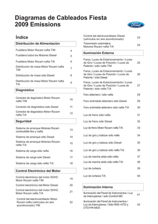 El documento proporciona un índice y diagramas de cableado para el Ford Fiesta 2009. Incluye diagramas para la distribución de alimentación, masa, diagnóstico, seguridad, control electrónico del motor, transmisión automática, iluminación externa e interna, sistemas eléctricos, clima, inmovilizador, cierre centralizado y entretenimiento. Cubre diferentes configuraciones de motor incluyendo nafta, diesel y transmisión automática o manual.
