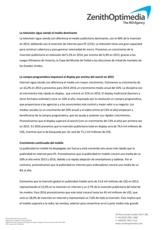 La tasa de crecimiento de la inversión publicitaria global está volviendo a los niveles anteriores a la crisis económica, impulsada por una economía más fuerte, la compra programática y el rápido crecimiento de la publicidad móvil. Se prevé que la inversión publicitaria crezca a una tasa del 5,5% en 2014, 5,8% en 2015 y 6,1% en 2016, principalmente debido a la mejora de la economía mundial, la proliferación de la compra programática y el auge de la publicidad móvil