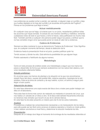 Este documento explica las técnicas de forense digital, incluyendo la recuperación de archivos eliminados, descifrado básico, búsqueda de archivos específicos y observación de áreas del computador. También describe principios como evitar la contaminación de evidencia, actuar metódicamente y controlar la cadena de evidencia. Finalmente, resume herramientas como Encase para la recolección de evidencia digital y técnicas de forense en máquinas individuales y redes.