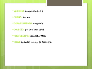 Este documento resume la actividad forestal de Argentina. Describe los dos tipos de bosques en el país, los nativos y los implantados. Detalla las principales regiones forestales de bosques nativos como el Parque Chaqueño, la Selva Misionera y la Selva Tucumano-Boliviana. También explica los usos de los recursos forestales y los desafíos de la deforestación. Finalmente, resume las características y potencial de los bosques implantados en el país.
