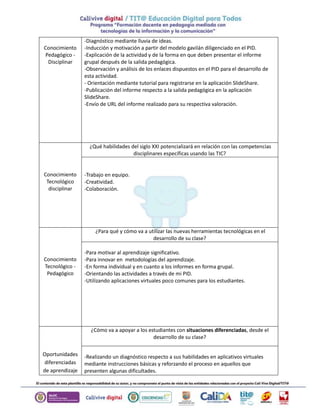 Este documento presenta un instrumento de diseño curricular didáctico adaptado de la matriz TPACK enriquecida con CTS. El proyecto se titula "Leo y comprendo en la era digital" y tiene como objetivo desarrollar competencias comunicativas y de comprensión lectora en estudiantes. Se utilizará un enfoque constructivista y metodología de proyectos individuales y grupales, haciendo uso de recursos TIC como aula virtual, portátiles, video beam, entre otros. Las estrategias incluyen diagnóstico, motivación, explic