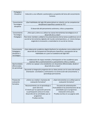 Este documento presenta un instrumento de diseño curricular didáctico para la introducción de teorías del conocimiento. El documento describe los objetivos de aprendizaje, conceptos centrales, enfoque pedagógico constructivista y recursos como textos, wikis y PowerPoint. También detalla estrategias como inducir la reflexión sobre el conocimiento humano y habilidades del siglo 21 usando herramientas TIC. Los estudiantes elaborarán mapas mentales y participarán en foros académicos para expresar su pensamiento crítico.