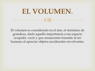 El documento habla sobre conceptos relacionados con el volumen y el relieve en la escultura. Explica que el volumen se refiere al espacio ocupado y a la sensación de grandeza que transmite un objeto escultural. Luego describe diferentes tipos de volumen y relieve como el volumen plano rígido, el volumen interno, volúmenes de superficies curvas, el alto relieve, bajo relieve y relieve pictórico. Finalmente, indica que el bulto es el espacio que ocupa una figura y su tamaño transmite una sensación de in