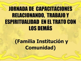 Este documento presenta una jornada de capacitaciones sobre cómo relacionarse, trabajar y comunicarse con espiritualidad y amor hacia los demás. El objetivo es fomentar una dimensión trascendental del trabajo donde se refleje alegría, entrega y felicidad. Se discuten pasajes bíblicos y formas de comunicarse de manera asertiva, respetuosa y positiva para promover la unidad, paz y alegría.