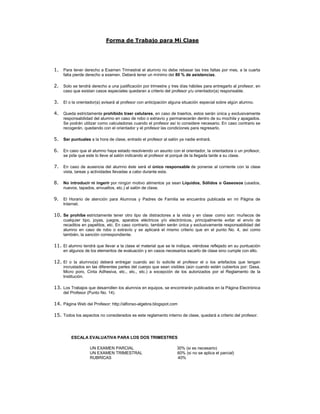 El documento establece las reglas y lineamientos para los alumnos de una clase. Para tener derecho a examen trimestral, un alumno no puede faltar más de tres veces por mes y debe asistir al menos el 80% de las clases. Solo se permite una justificación por trimestre. No se permite usar celulares u otros distractores en clase, y los alumnos deben ser puntuales. Los alumnos son responsables de ponerse al día si faltan a clase.