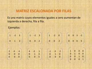 Este documento explica los conceptos de matriz escalonada por filas, matriz escalonada reducida por filas y pivote de una matriz. Una matriz escalonada tiene ceros que aumentan de izquierda a derecha fila por fila, mientras que una matriz escalonada reducida tiene unos en las columnas con los únicos elementos no nulos. El pivote es el primer elemento no nulo de cada fila. El documento también incluye ejemplos y ejercicios resueltos de reducir matrices a estas formas.