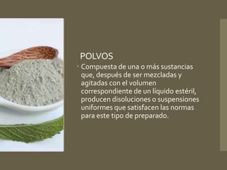 Este documento describe diferentes formas farmacéuticas sólidas como polvos, comprimidos, tabletas, grageas, cápsulas y sus propiedades, ventajas y desventajas. Explica los procesos de preparación, composición y aplicaciones de cada forma.