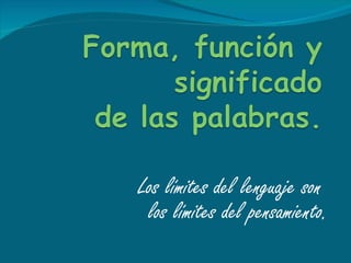 El documento describe la complejidad del lenguaje humano y cómo se puede analizar utilizando el triángulo de significado, forma y función. Explica que la forma se refiere a aspectos morfológicos como el género y número de palabras, mientras que la función se refiere a cómo se relacionan las palabras dentro de una oración, como sujeto, objeto directo, etc. Además, provee ejemplos de diferentes unidades lingüísticas clasificadas según su forma y función.