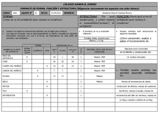 El documento describe la forma, función y estructura de un artefacto que dos estudiantes van a construir. La forma del artefacto incluye una base rectangular, un cubo, un cuerpo y cabeza cilíndricas para un muñeco, y poleas. Se ensamblará usando puntillas, bielas, pegamento y madera. Su función es explicar el funcionamiento de máquinas mono-funcionales y desarrollar habilidades en diseño y construcción.