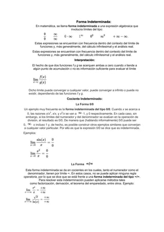 Este documento describe las diferentes formas indeterminadas que se presentan al evaluar límites de funciones, incluyendo 0/0, ∞/∞, 0·∞, y potencias indeterminadas. Explica que estas expresiones surgen cuando el numerador y denominador tienden a cero o infinito, haciendo imposible aplicar reglas algebraicas directamente. Se deben usar métodos como factorización, derivación o el teorema del emparedado para resolver las indeterminaciones y encontrar el valor del límite. Finalmente, presenta una tabla resumiendo las distintas formas in