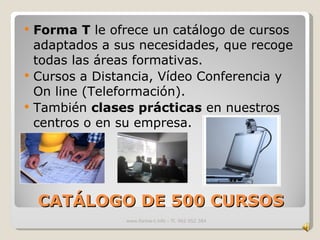 Forma T ofrece un catálogo de 500 cursos adaptados a las necesidades de los trabajadores, incluyendo modalidades a distancia, videoconferencia y clases prácticas. La formación continua es clave para el desarrollo empresarial y se puede bonificar para deducir costes. Con 10 años de experiencia, ofrecen asesoramiento para capacitar y motivar a los empleados.