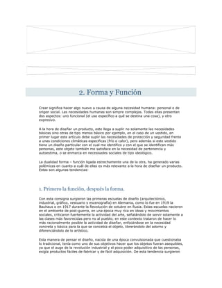 El documento discute la relación entre la forma y la función en el diseño. Presenta tres enfoques: 1) Primero la función, luego la forma, con un énfasis en la funcionalidad y necesidades básicas. 2) Primero la forma, luego la función, con un enfoque en el estilo y las necesidades expresivas. 3) La función y la forma son interdependientes, tomando en cuenta ambos aspectos.
