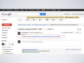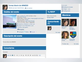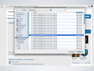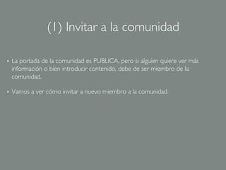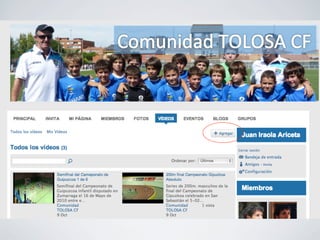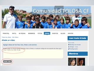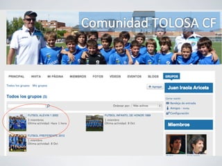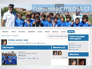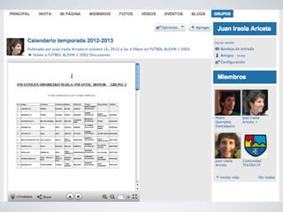 El documento proporciona instrucciones para crear y administrar una comunidad en línea para un club deportivo local. Explica cómo invitar miembros a la comunidad, crear grupos para cada equipo, compartir fotos, calendarios y eventos, y publicar blogs y videos para mantener informados a los miembros de la comunidad.