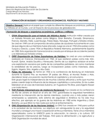 Este documento resume la formación y objetivos de varios bloques y organismos económicos, políticos y militares a nivel mundial e internacional, incluyendo la OTAN, OPEP, Países No Alineados, TIAR, ONU, Unión Europea, G8, TLC, ALCA y OMC. También explica brevemente el concepto de globalización y sus implicaciones económicas, ambientales y políticas como la interdependencia comercial, los impactos ambientales y el debilitamiento del Estado-nación.