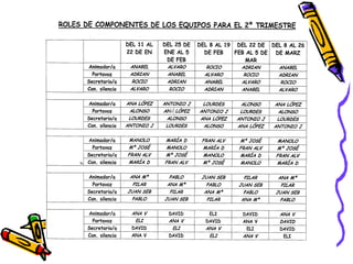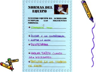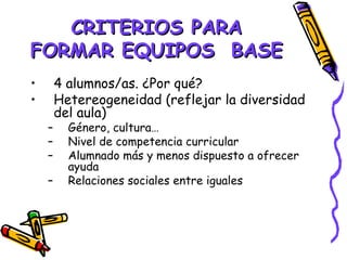 Este documento proporciona información sobre la formación de equipos de trabajo en el aula. Describe criterios como la heterogeneidad de género, cultura y nivel académico para formar equipos de 4 estudiantes. También presenta estrategias como observaciones, cuestionarios y tests para analizar las relaciones entre los estudiantes y formar equipos equilibrados. El documento incluye formatos como sociogramas y cuestionarios de solidaridad para recopilar datos, así como consideraciones sobre roles, funciones y evaluación de los equipos.