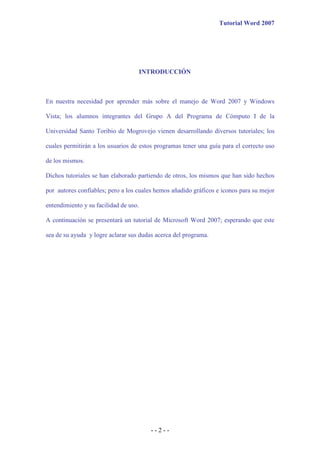Este documento presenta un tutorial básico de Microsoft Word 2007. Explica las funciones principales de Word 2007 como arrancar el programa, crear un primer texto, y los elementos clave de la interfaz como la banda de opciones, la barra de herramientas de acceso rápido y la barra de estado. También cubre acciones básicas como formato de texto, impresión y revisión ortográfica. El objetivo es proporcionar una guía para el uso correcto de Word 2007 y aclarar dudas sobre el programa.