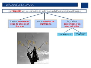 Este documento describe las unidades fundamentales de la lengua y los procesos de formación de palabras. Explica que las palabras se componen de morfemas, que son las unidades mínimas de significado, y de fonemas, que son las unidades mínimas sin significado. Además, clasifica las palabras en diferentes clases y describe los principales procedimientos para formar nuevas palabras, como la derivación, composición y abreviación.
