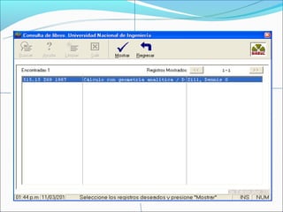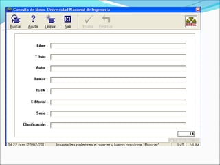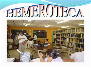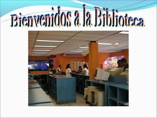 Este documento presenta las normas y servicios de una biblioteca universitaria. Detalla las medidas para el depósito de bolsos y comportamiento adecuado en las distintas áreas. Explica los requisitos para préstamos, deberes de los usuarios y servicios como préstamos a domicilio, hemeroteca, sala de informática, catálogos y horario de atención.