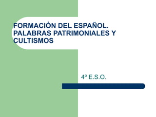 Este documento describe tres tipos de palabras del español derivadas del latín: palabras patrimoniales, cultismos y dobletes. Las palabras patrimoniales han evolucionado naturalmente desde el latín vulgar y constituyen el vocabulario más antiguo. Los cultismos son palabras tomadas directamente del latín una vez consolidada la lengua romance, conservando una forma similar a la original. Los dobletes son pares de palabras con la misma raíz latina pero con usos independientes en la actualidad.