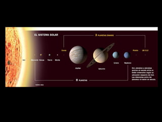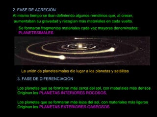 La teoría del origen del sistema solar propone que: (1) una nube de gas y polvo colapsó bajo su propia gravedad para formar el Sol y una nebulosa protoplanetaria, (2) en la nebulosa se formaron fragmentos llamados planetesimales que crecieron mediante acreción hasta formar planetas, y (3) los planetas interiores rocosos se formaron cerca del Sol mientras que los planetas exteriores gaseosos se formaron más lejos.