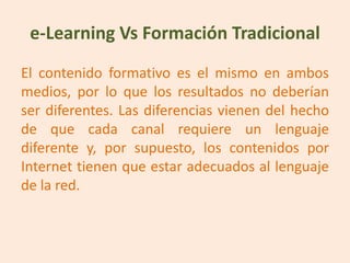 El documento compara el e-learning y la formación tradicional, destacando que las principales diferencias son la forma de interacción (cara a cara vs en línea), el alcance (local vs global), el ritmo de aprendizaje (fijado por el instructor vs autodirigido), y las relaciones interpersonales (más directas vs más distantes). El e-learning permite una mayor flexibilidad en cuanto a horarios y acceso a materiales, pero requiere una mayor motivación por parte del estudiante.