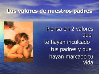 El documento habla sobre la importancia de los valores y su transmisión entre generaciones. Explica que los padres juegan un papel fundamental en enseñar valores a sus hijos a través del ejemplo y la educación. También presenta una jerarquía de valores donde lo más importante es la religión, la moral y la ciencia, mientras que lo material como el poder y la técnica tienen menos valor intrínseco. Finalmente, enfatiza la responsabilidad de los padres de captar, estimar, sentir y vivir los valores para poder transmitirlos a los hijos.