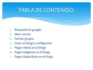 Este documento proporciona instrucciones sobre cómo crear y personalizar un blog utilizando servicios de Google como Gmail y Blogger. Explica cómo buscar en Google, abrir una cuenta de correo electrónico de Gmail, formar grupos, y luego crear un blog en Blogger y agregar videos, imágenes y diapositivas para personalizarlo. También brinda información básica sobre los productos y servicios principales de Google como su motor de búsqueda, Gmail, Google Earth, Google Talk, YouTube y Android.