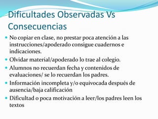 Este documento presenta varios desafíos de comportamiento que enfrentan los estudiantes y sus consecuencias, y ofrece recomendaciones a los padres para abordarlos. En particular, sugiere que los padres dejen que sus hijos asuman la responsabilidad de las tareas escolares en lugar de resolver los problemas por ellos, y supervisar que completen sus deberes para fomentar hábitos de responsabilidad.