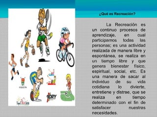 El documento contiene definiciones de conceptos relacionados con el deporte, la recreación y la salud como recreación, deporte, educación física, cultura, grasa, masa corporal y métodos para calcular el índice de masa corporal. Explica que la recreación es una actividad que genera bienestar y distracción, el deporte sigue reglas para mejorar la salud, y la educación física promueve el desarrollo integral mediante el movimiento del cuerpo.