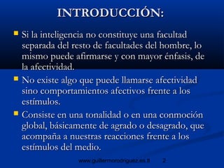 Este documento discute la formación de la afectividad humana. Explica que la afectividad es fundamental para el comportamiento y que su educación es compleja, influyendo factores como la familia y la sociedad. También destaca la importancia de evitar perturbaciones en el desarrollo afectivo de los niños y propone objetivos como presentar experiencias que fomenten sentimientos positivos a través de asignaturas como música, literatura y educación física.