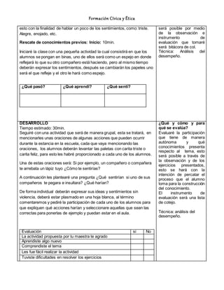 Este documento presenta el plan de estudios de una clase de Formación Cívica y Ética para el tercer grado de primaria. El objetivo de la clase es enseñar a los estudiantes a expresar emociones y establecer metas sin violencia. La clase consiste en varias actividades como dibujar sentimientos, reflejar emociones con compañeros, y discutir cómo responder a situaciones hipotéticas. Al final, los estudiantes escribirán sobre momentos felices o tristes para evaluar lo que han aprendido.