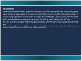 El documento detalla la vocación y experiencias de un individuo en el ámbito de la comercialización desde su juventud, así como diversos métodos y estrategias de venta. Se aborda la importancia del liderazgo, la oratoria, la imagen personal y el uso de la tecnología digital en el marketing y la venta. Además, se exploran conceptos de sociología y economía relacionados con el desarrollo personal y profesional en el sector inmobiliario y la creación de marcas.