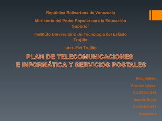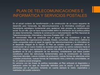 Este documento presenta un resumen de un plan de telecomunicaciones e informática y servicios postales para Venezuela. El plan tiene como objetivo definir la orientación de la política pública de estas herramientas para apoyar el proceso de transformación social del país. El plan se construirá con aportes de ciudadanos y organizaciones y definirá la visión compartida sobre el papel de las telecomunicaciones y la informática en el desarrollo de la nación de manera soberana e inclusiva.
