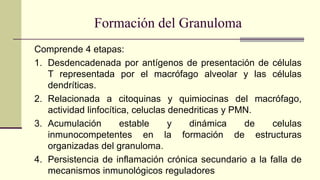 La formación del granuloma es un proceso dinámico en 4 etapas que involucra la interacción de macrófagos, células dendríticas, células T y otras células inflamatorias. Estas células se comunican a través de citoquinas y quimiocinas para reclutarse mutuamente y organizarse en una estructura granulomatosa. La persistencia del granuloma depende de la continua interacción entre estas células y su resistencia a la apoptosis. Con el tiempo, la inflamación crónica puede conducir a