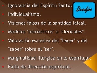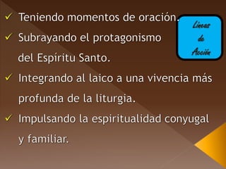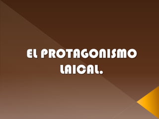 Este documento discute el protagonismo laical en la Iglesia y líneas de acción para promoverlo. Resalta la importancia de que los laicos vivan su fe en el mundo desde su vocación propia y dentro del marco eclesiástico. También identifica obstáculos como la desconexión entre fe y vida o la falta de formación. Propone medidas como enseñar el Evangelio, fomentar la conciencia de ser parte de la Iglesia y dar prioridad a la familia, siempre guiados por la doctrina social cristiana y promoviendo la solid
