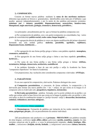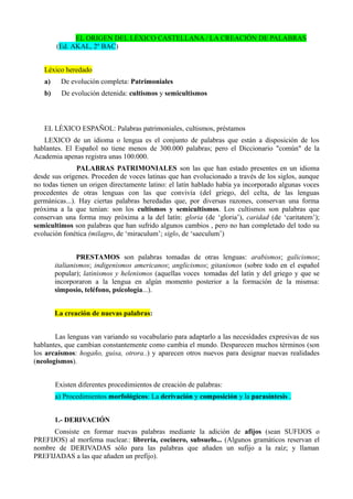 El documento describe el origen y creación de palabras en el léxico castellano. Explica que las palabras patrimoniales proceden de voces latinas evolucionadas a través de los siglos, mientras que los préstamos provienen de otras lenguas como el árabe, francés e inglés. Describe los principales procedimientos de creación de palabras como la derivación, composición y préstamos. Explica que las lenguas van variando su vocabulario para adaptarse a las necesidades expresivas cambiantes de sus hablantes.