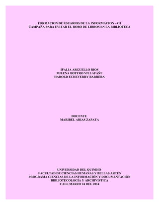 Este documento presenta una propuesta para realizar una campaña en la biblioteca con el fin de evitar el robo y daño de libros. La campaña incluirá una exposición de libros dañados para crear conciencia en los usuarios, volantes informativos, y carteles con mensajes sobre la importancia de cuidar los libros. También propone establecer reglas claras sobre el manejo de libros y designar un responsable de seguridad para la biblioteca.