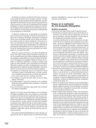 Este documento describe los fundamentos para realizar búsquedas bibliográficas efectivas en la gran cantidad de información disponible. Explica que los profesionales deben familiarizarse con las herramientas de búsqueda como lenguajes controlados y bases de datos, así como seguir etapas como analizar conceptualmente los términos clave, formular una estrategia de búsqueda y modular los resultados según la precisión o exhaustividad necesaria. De esta forma, los profesionales podrán encontrar de manera autónoma la información científica necesaria para