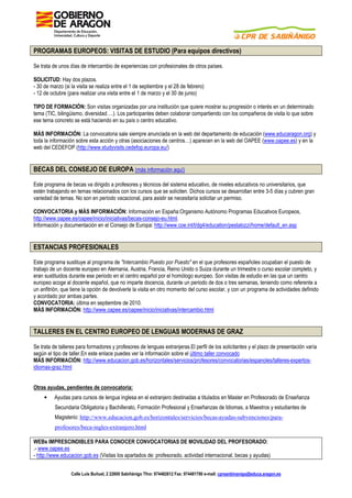 Este documento describe varias opciones para que maestros y profesores obtengan formación lingüística y didáctica en el extranjero, incluyendo programas europeos, cursos de verano, becas del Consejo de Europa, y talleres en Austria. Proporciona detalles sobre plazos de solicitud, tipos de formación disponibles, y sitios web con más información.