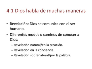 El documento aborda las características de la revelación cristiana, destacando que Dios se comunica con la humanidad a través de la creación, la conciencia y la Palabra. La revelación en la creación permite al ser humano conocer a Dios como su creador y culmina en la figura de Jesucristo, quien revela la intimidad divina. Además, se reconoce que existe revelación en otras religiones, sugiriendo que Dios también habla a sus seguidores mediante elementos de gracia y verdad.