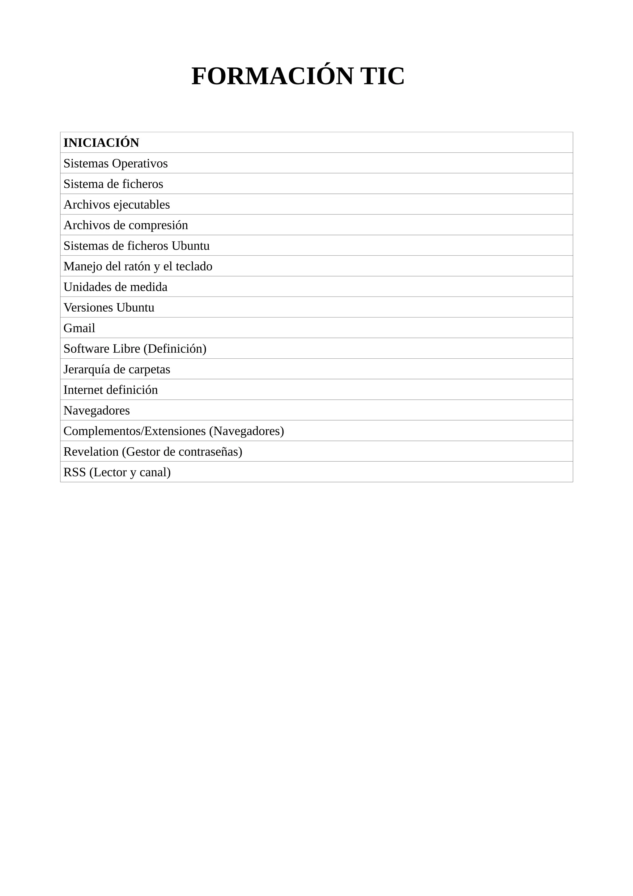 Este documento presenta una lista de temas para una formación en Tecnologías de la Información y Comunicación (TIC). Los temas incluyen sistemas operativos, software libre, navegadores web, herramientas de ofimática como LibreOffice, programas de imagen como Gimp, habilidades para formadores, redes sociales como Twitter, plataformas web 2.0 y recursos en línea como Google Drive y Dropbox. También cubre comandos básicos de sistemas como mkdir, ls y apt-get para gestionar software en sistemas Ubuntu.