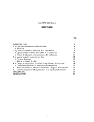 Este documento resume los aspectos fundamentales de la educación en la antigüedad griega y romana, así como la concepción de la educación en la Edad Media según Santo Tomás de Aquino. En la antigüedad, la educación griega y romana era privada y se enfocaba en la literatura, las matemáticas y la formación de la elite para la burocracia. Santo Tomás veía la educación como un proceso de desarrollo de las potencialidades humanas a través de la nutrición, instrucción y disciplina que el padre