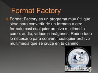 Format Factory es un programa gratuito que permite convertir archivos multimedia entre diferentes formatos como video, audio e imágenes. Ofrece opciones para personalizar la conversión y soporta formatos populares como MP4, MP3, JPG. Audacity es otro programa de código abierto multiplataforma para grabar, editar y convertir archivos de audio que también permite la edición de múltiples pistas y agregar efectos de sonido. Ambos programas son gratuitos y funcionan en sistemas operativos Windows.