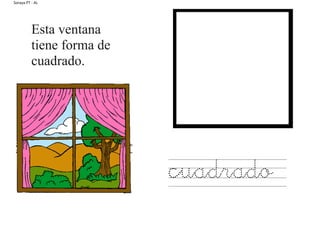 El documento describe las formas de diferentes objetos como una piruleta circular, una ventana cuadrada, una puerta rectangular, una cometa en forma de rombo, un huevo ovalado, una patata triangular, una tarta en forma de corazón y una galleta con forma de estrella.