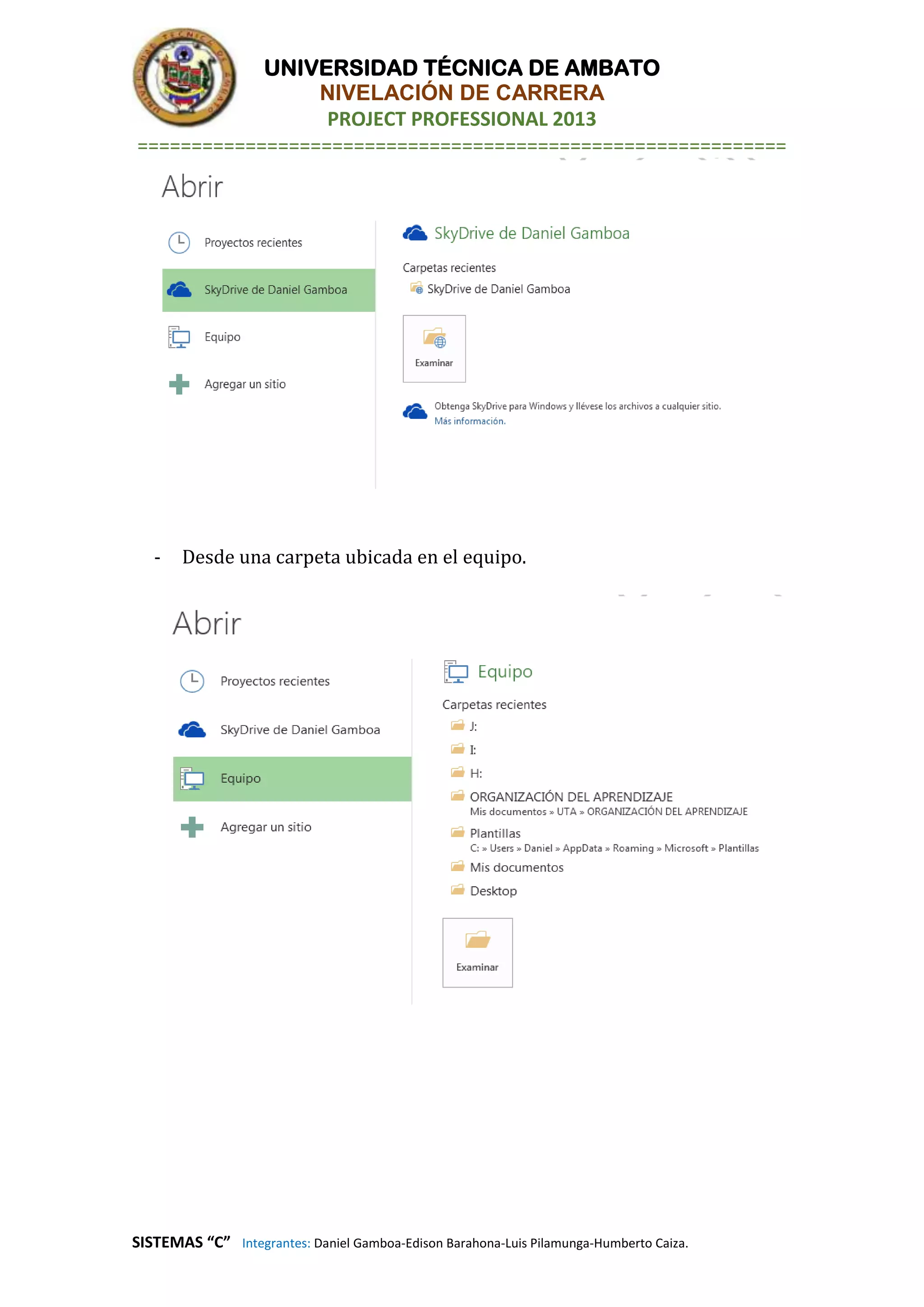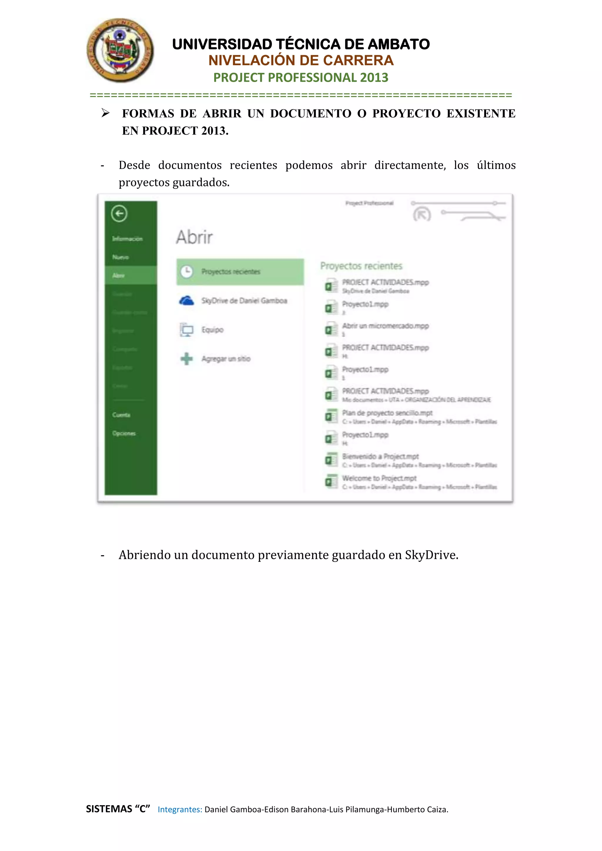 El documento describe tres formas de abrir un proyecto existente en Microsoft Project 2013: 1) abrir proyectos recientes directamente desde la aplicación, 2) abrir un proyecto guardado previamente en SkyDrive, y 3) abrir un proyecto guardado en una carpeta local en el equipo.