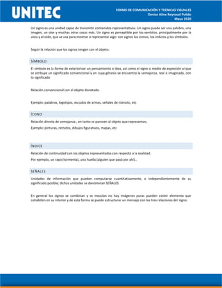 El documento describe diferentes formas y técnicas de comunicación visual, incluyendo la comunicación textual, verbal, sonora y visual. También explica conceptos como marca, signo, símbolo e ícono. Finalmente, detalla una variedad de técnicas visuales como equilibrio, simetría, simplicidad y economía.