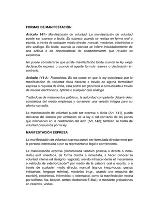 El documento describe las diferentes formas en que puede manifestarse la voluntad de acuerdo a la ley, incluyendo de manera expresa o tácita. También explica cómo los actos jurídicos pueden realizarse a través de medios electrónicos, informáticos o telemáticos y llevar una firma digital válida. Finalmente, detalla los requisitos y características de la firma digital de acuerdo a la legislación peruana.