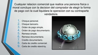 Este documento describe varias formas de pago internacionales como cheques personales y bancarios, órdenes de pago, cartas de crédito y remesas. Explica los riesgos y beneficios de cada método para el exportador, señalando que las cartas de crédito ofrecen mayor seguridad al brindar pago garantizado mientras que los cheques personales implican el riesgo más alto de no pago.