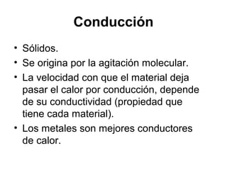 El documento describe tres formas de transmitir calor: conducción, convección y radiación. La conducción ocurre en sólidos y depende de la conductividad de cada material. La convección ocurre en fluidos como líquidos y gases, donde el calor se transfiere a través de la circulación del fluido. La radiación no requiere contacto entre las sustancias, permitiendo la transferencia de calor a través de gases o el vacío.